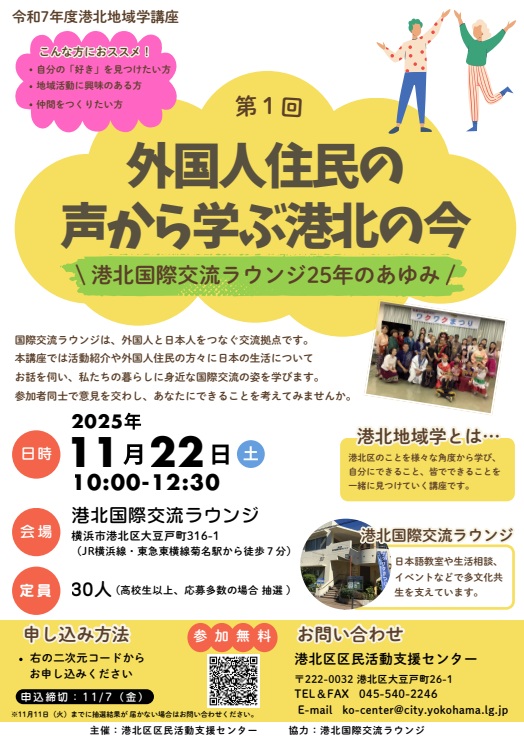 テーマは「外国人住民の声から学ぶ港北の今 ~港北国際交流ラウンジ25年のあゆみ~」です。