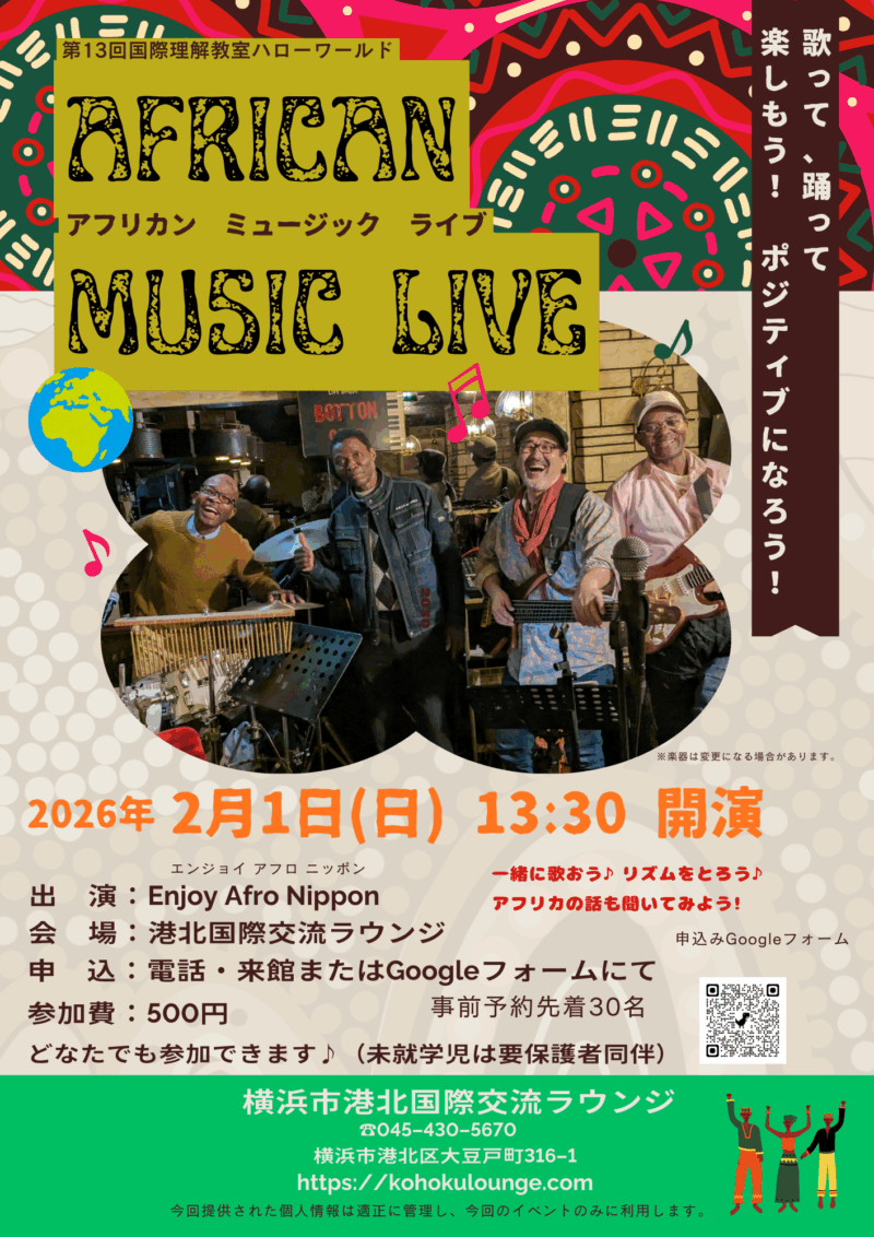 简体中文多国籍乐队”Enjoy Afro Nippon”将来港北国际交流处举办现场演奏会♪