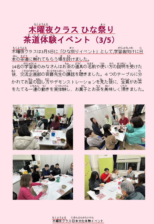 【イベント報告】日本語教室木曜夜クラス ひな祭り茶道体験